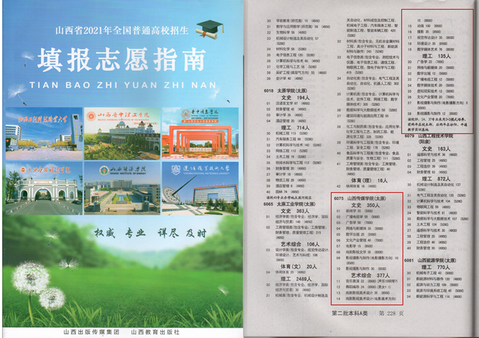 山西省志愿填报时间7月22日8:00—7月24日18:00《山西省2021年全国普通高校招生志愿填报指南》 第228页 招生代码:6075