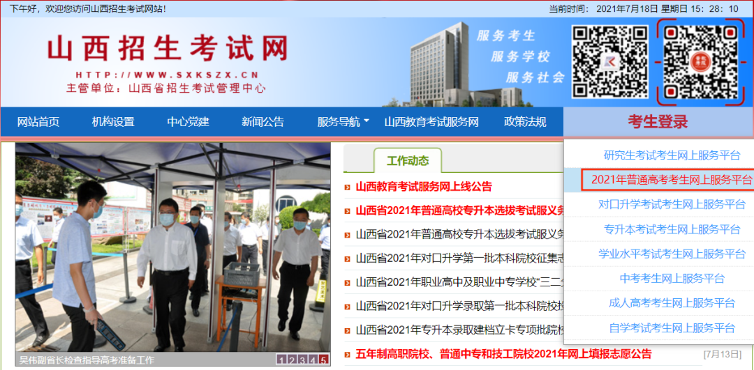 计算机浏览器地址栏中输入“山西招生考试网”(www.sxkszx.cn),在主页面的“考生登录”菜单中的“普通高考考生网上服务平台”进入网上填报志愿登录窗口,输入考生号、登录密码、验证码,进入网上填报志愿系统。
