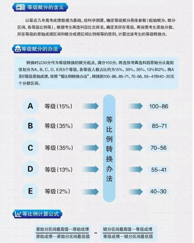 各科目成绩计入考生总成绩时,将A至E等级内的考生原始成绩,按照事先确定的比例,依照转换公式,分别转换到100~86、85~71、70~56、55~41、40~30五个分数区间,得到考生的赋分成绩。转换基数为实际参加该科目选择考的人数。