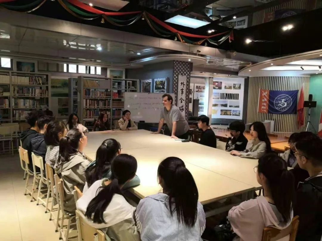 加拿大卡普顿大学在欧美馆举办文化沙龙讲座场馆内设施齐全,墙壁上设有世界地图、欧美一线城市建筑及文化风景照,同时配备有钢琴,陈列了内容丰富的外文原版书籍、杂志以及多媒体资料。每月会定期邀请校内外籍