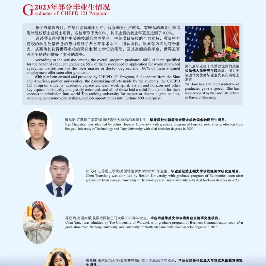《中美人才培养计划》121双学位项目是教育部所属中国教育国际交流协会(CEAIE)、中教国际教育交流中心(CCIEE)和美国州立大学与学院协会(AASCU)共同管理的新型中美高等教育双向交流与合作项目,项目旨在通过创新人才培养模式,培养国际创新型人才。该项目已列入“第七轮中美人文交流高层磋商机制”成果及“首轮中美社会与人文对话行动计划”执行项目。