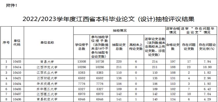 新闻中心讯(教务处 顾金波供稿)近期,江西省教育厅发文公布2023年本科毕业论文(设计)抽检评议结果,根据国务院教育督导委员会《关于做好本科毕业论文(设计) 抽检工作的通知》文件要求,全省2022—2023 学年度本科毕业论文(设计)抽检工作已顺利完成。本次按照教育部学位与研究生教育发展中心有关要求将抽检结果予以反馈,我校被抽检的63篇本科毕业设计(论文)均顺利通过,合格率为100%。
