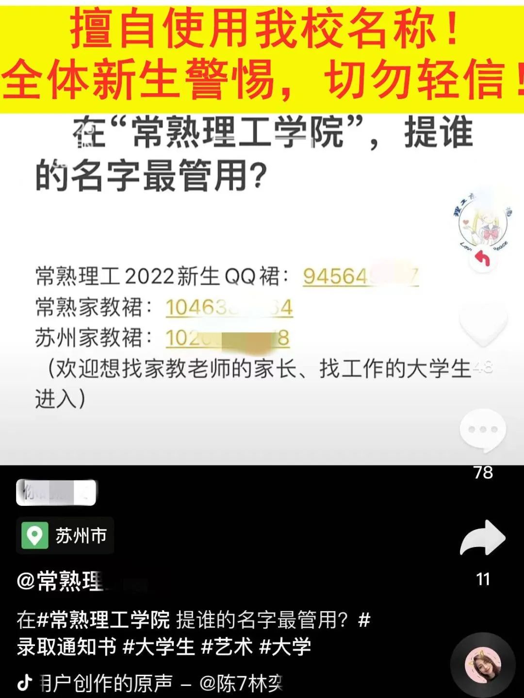近日,我校2022年本科录取结果已经可以查询,网络诈骗也进入多发期,可能出现“常熟理工兼职群”“理工表白墙”“