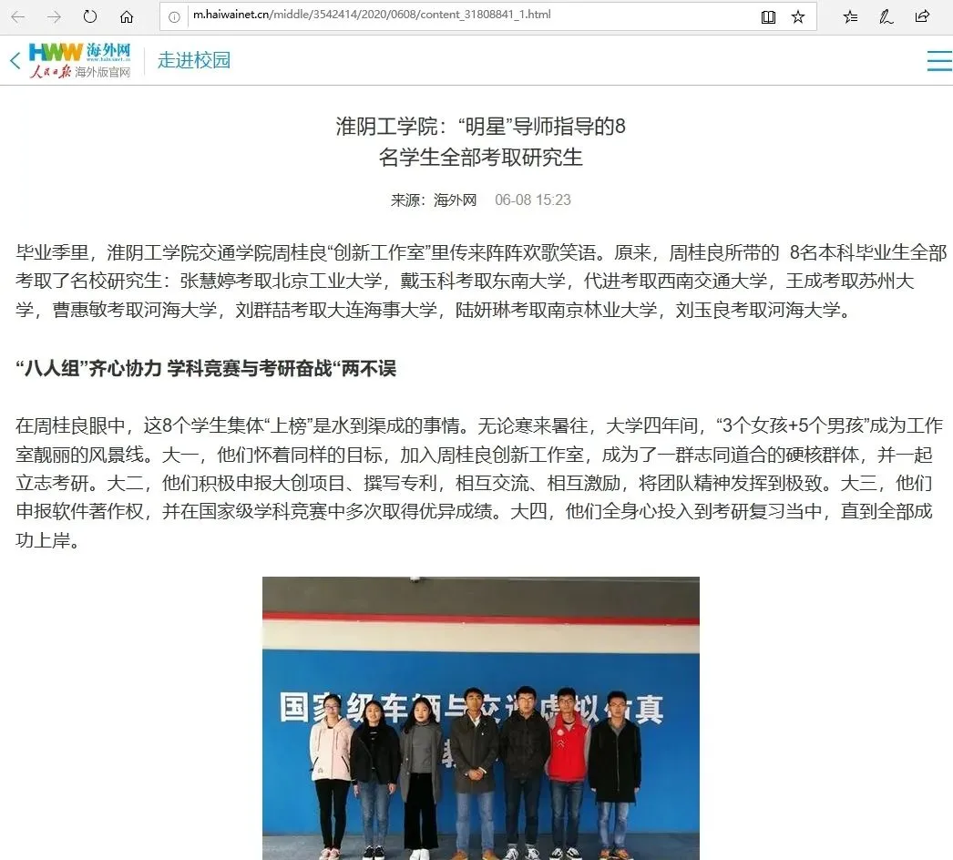 2020年交通工程学院周桂良博士“创新工作室”八名学生全部考取研究生事迹,被人民日报海外版官网宣传。