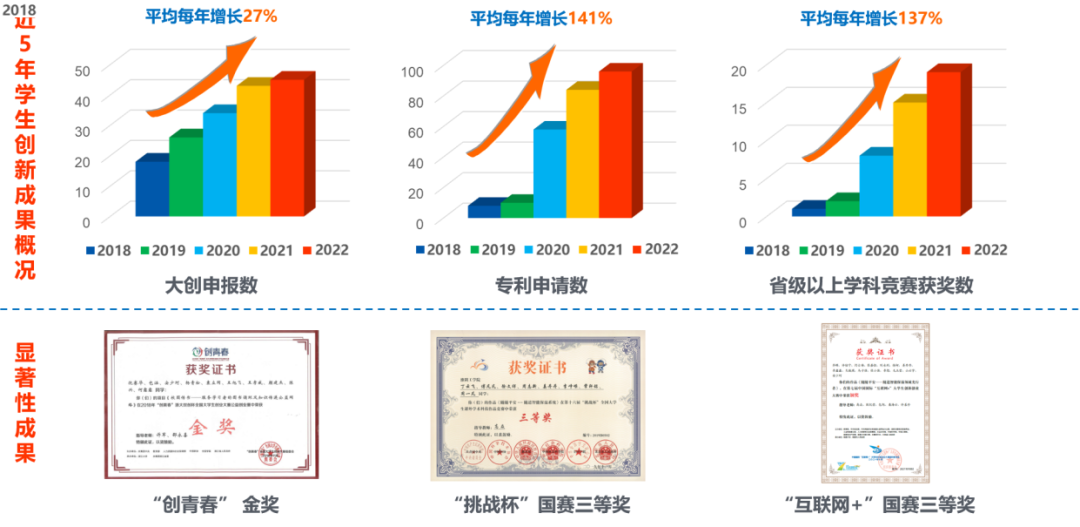 学院强化创新创业能力训练,开展分层次、多样化、惠及全体学生的创新创业教育平台,积极鼓励和支持学生参加各级各类创新创业实践活动。学院每年开设“翔宇”竞赛实验班、“一院一品”、“一专一品”等系列实践活动,五年来,学院学生获得中国国际“互联网+”大赛国赛铜奖、“挑战杯”全国大学生课外学术科技作品竞赛三等奖、“创青春”全国大学生创业大赛金奖、全国大学生节能减排社会实践与科技竞赛三等奖、挑战杯省赛三等奖、黑科技一等奖等180余项省级及以上学科竞赛奖项,学生参与省级及以上学科竞赛共计400余人次,申报大学生创新创业计划训练项目200余项,其中省级重点项目20项,省级项目51项,申报183项专利,其中86项发明专利。