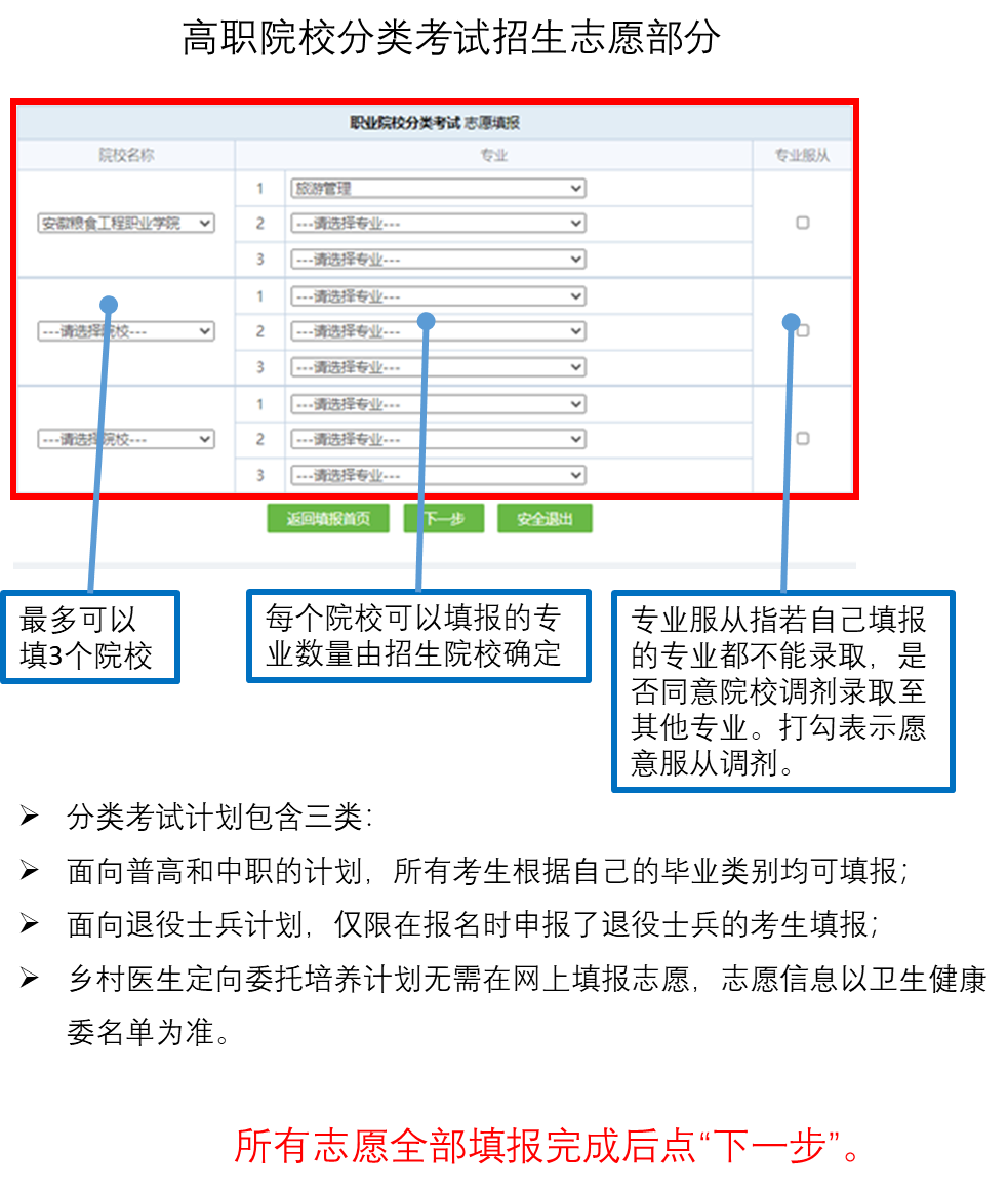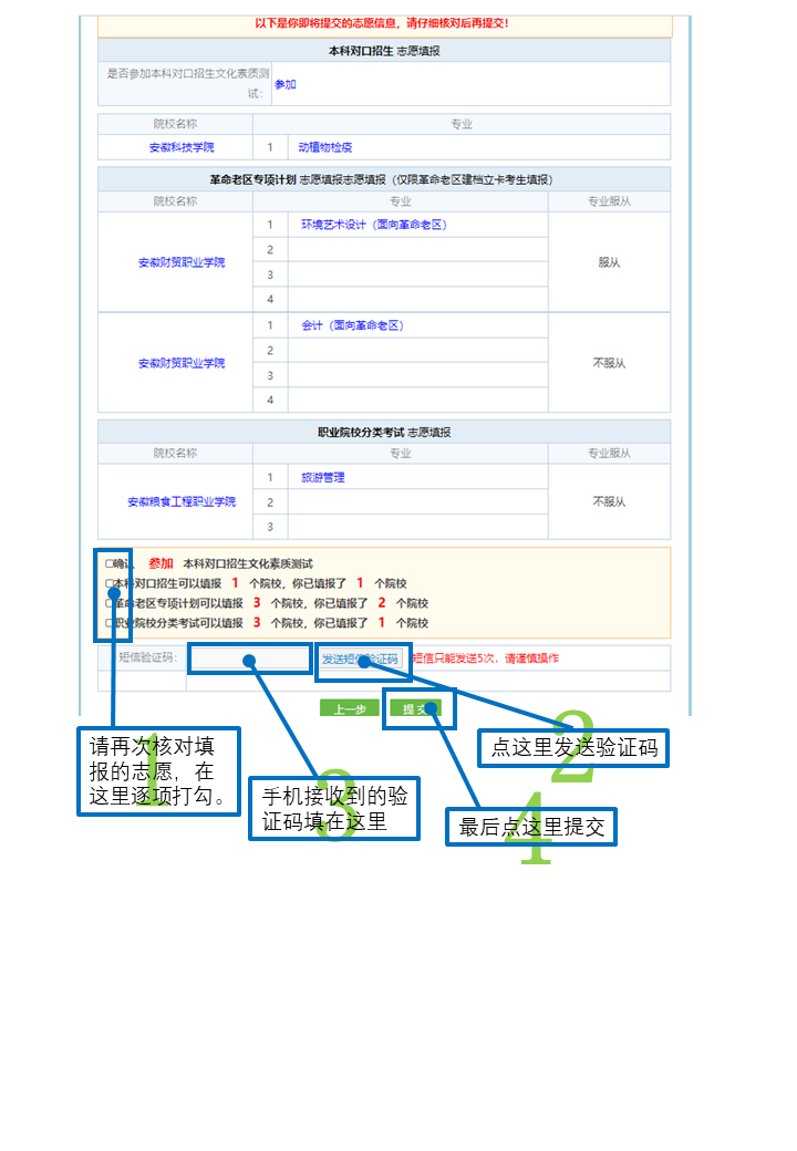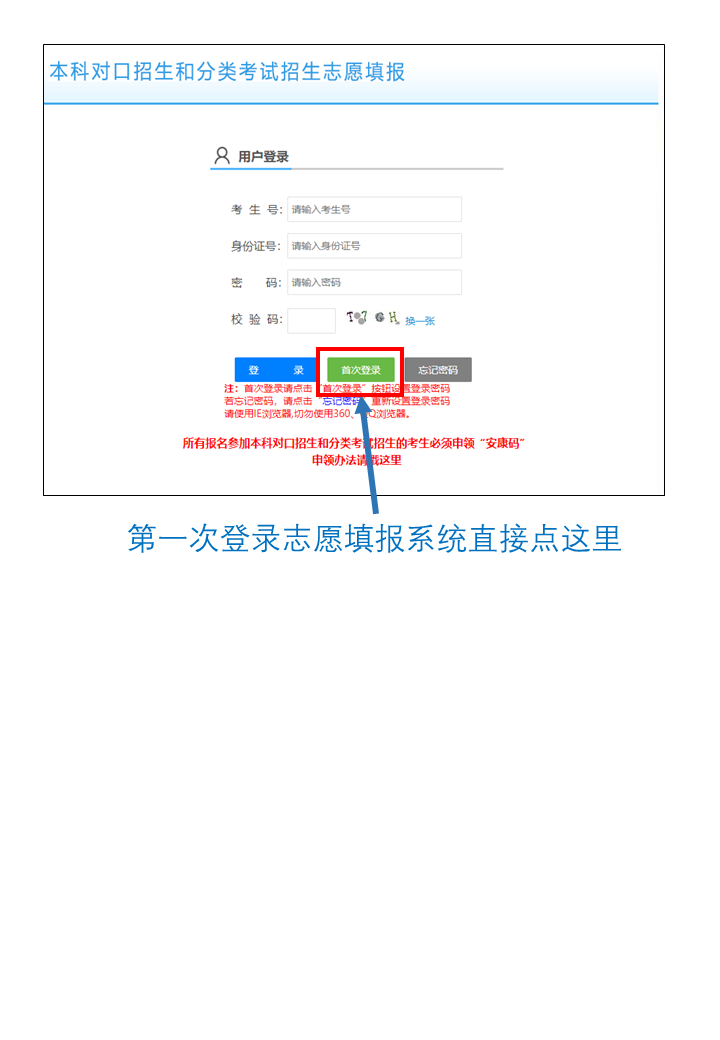 3.首次登陆和志愿提交时均会发送短信验证码,如遇无法接收短信验证码、遗忘考生号等问题,请联系报名点或当地招办。