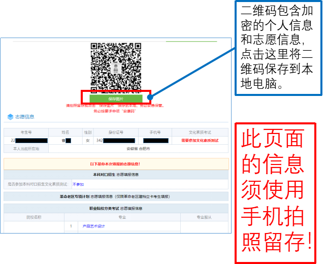 3.一部手机用于接收验证码,手机号码为报名时填报的“联系电话”。手机能够拍照,用于拍照留存填报成功后生成的二维码和志愿信息。