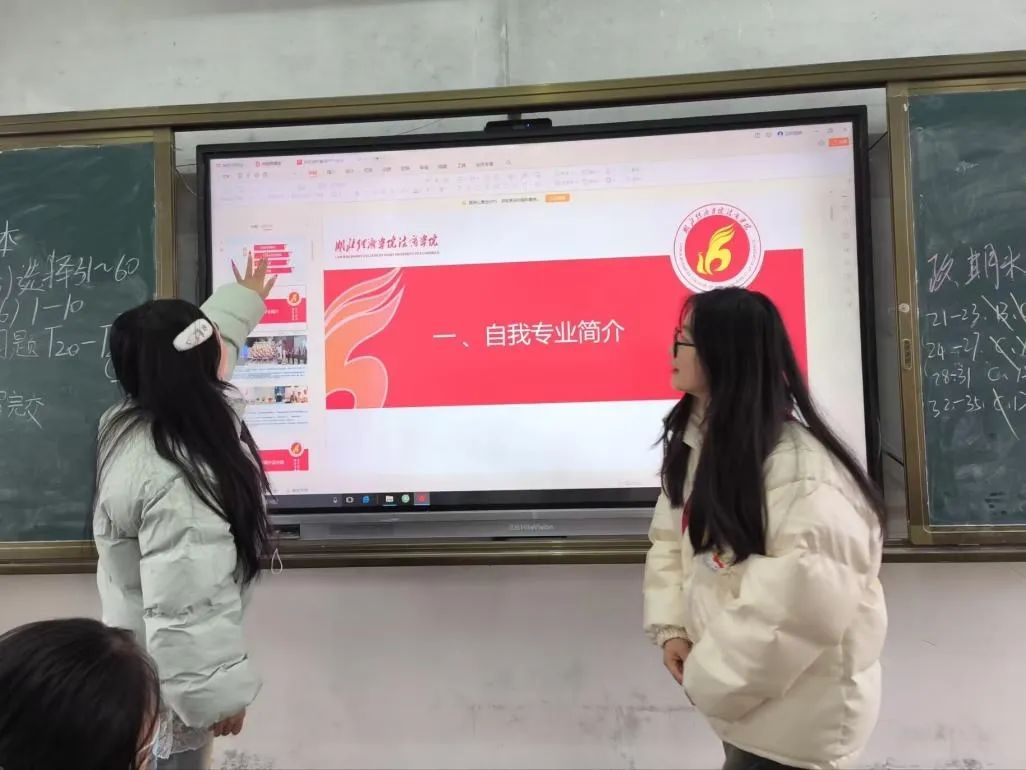 在活动正式开始前,我和我的团队成员一起联系母校的老师,并获得了进班宣传的许可。之后我们对照回访母校宣讲ppt制作了一份内容丰富完整的ppt,ppt围绕法商风情、法商分数线、法商生活等等。
