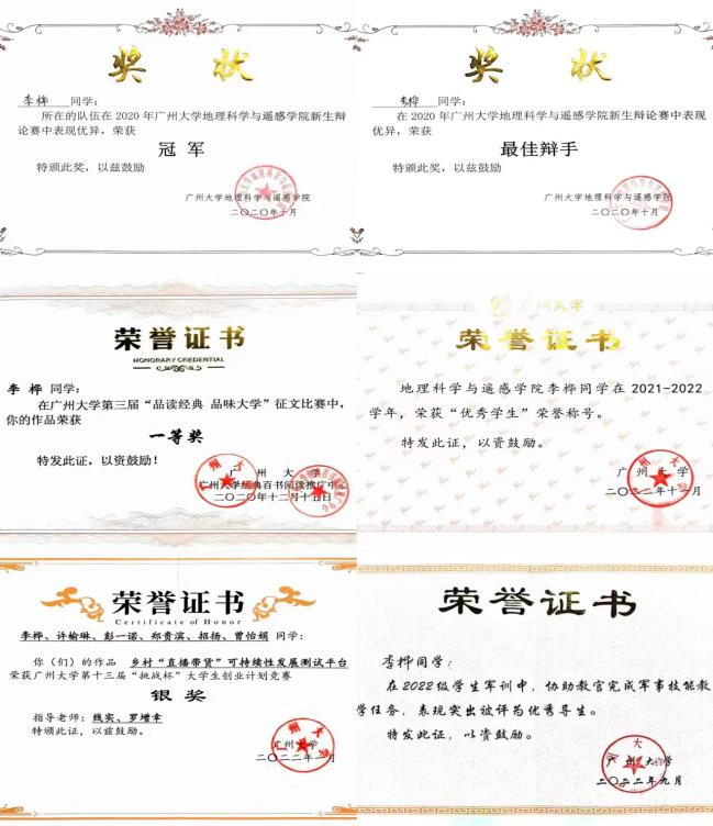 她脚踏实地,行稳致远。李桦的学业成绩和综合测评连续两年专业第一,曾获国家奖学金、优秀共青团干部、优秀学生、优秀导生等荣誉。在国家、省市和校级比赛中获奖30余项,荣获广东省第十七届“挑战杯”特等奖、第十八届“挑战杯”全国大学生课外学术科技作品竞赛二等奖。