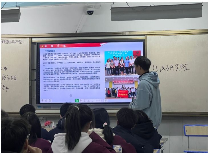 在此次活动中,我在两个班级进行宣讲,每个班级的同学都很热情的向我们提问,他们那种对于大学生活的好奇深深感染了我,看着班级里密密麻麻的书本和坐的挺直的身姿以及熟悉的校服,好似带我回到了那个充满奋斗与天真的日子。在介绍完ppt之后,我们又播放了一段在法商生活片段的纪录片让他们更加深入了解了真正的大学生,大学生活是什么样,使他们对大学有了更多的憧憬与遐想。我很开心将自己的大学生活分享给母校的学弟学妹们,也获得了了解法商更多主要概况的机会。