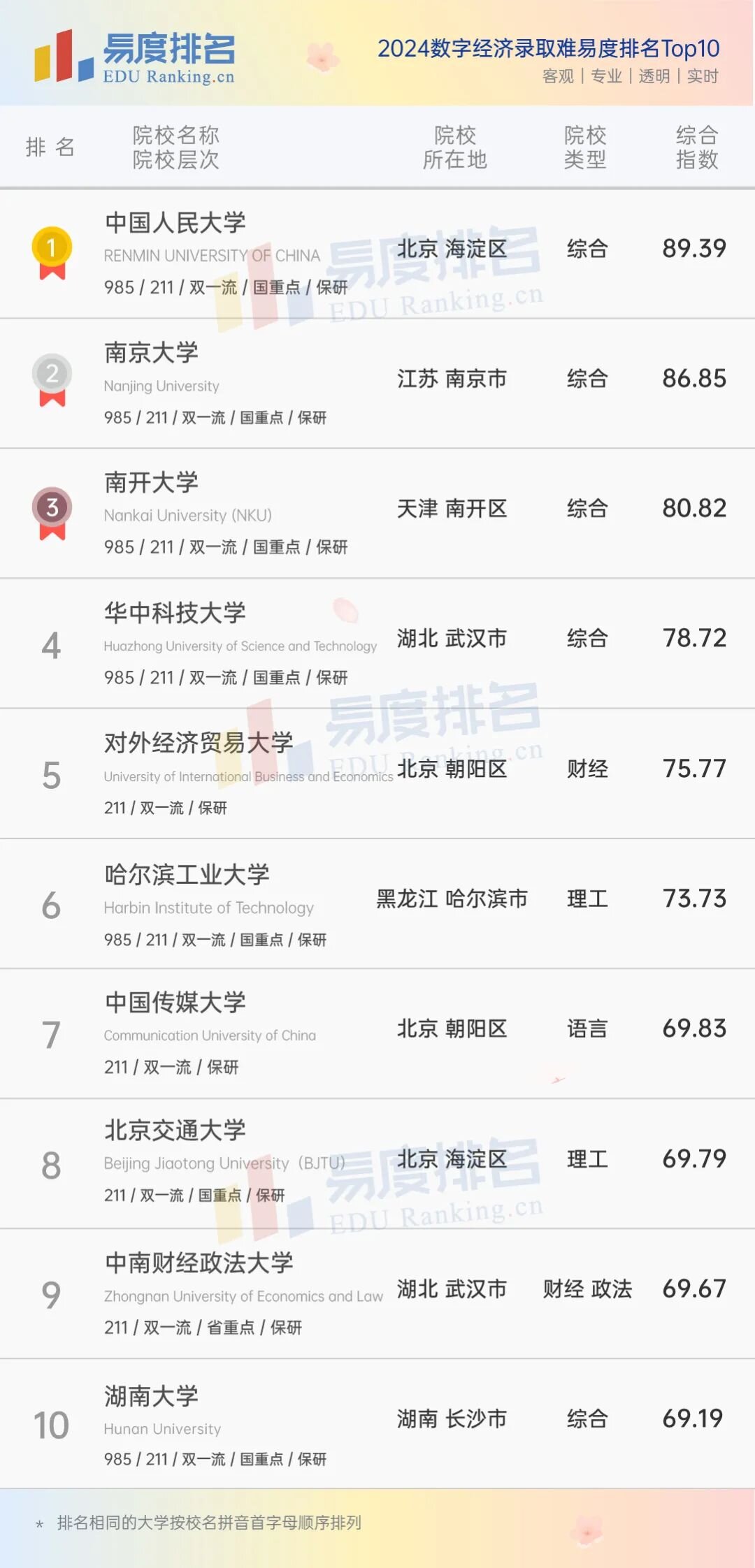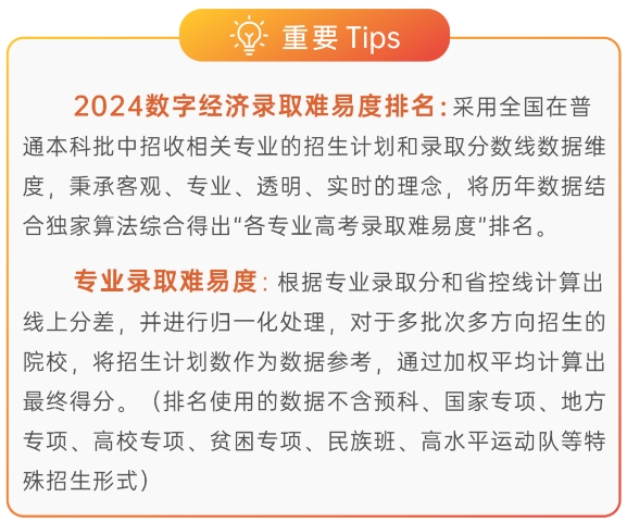 哪些学校值得报考呢?本期易度排名将公布“2024数字经济专业录取难易度排名”前100排名。