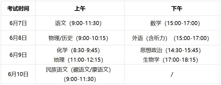 统一高考科目考试时间以教育部公布为准,如有调整,选择性考试科目和民族语文科目的考试安排相应调整。艺体类考生全省专业统一考试具体安排另行通知。