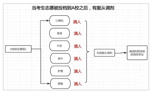 如果有服从调剂,哪怕6个专业都没法上,但院校也会把你调剂到其他专业保住学位。如果你所填报的第一个院校专业组志愿人满了,学生志愿档案投不进去学校,这种情况无论考生服不服从调剂,都会直接检索第二志愿。