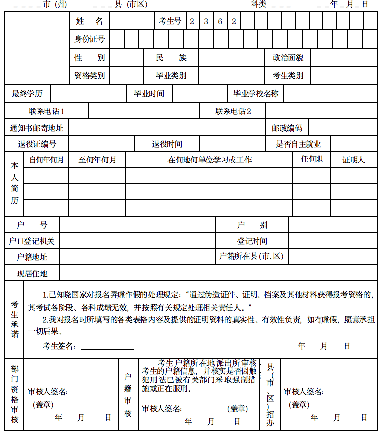 9.“户籍审核”栏。由考生户籍所在地派出所审核考生的户籍信息,并核实是否因触犯刑法已被有关部门采取强制措施或正在服刑。