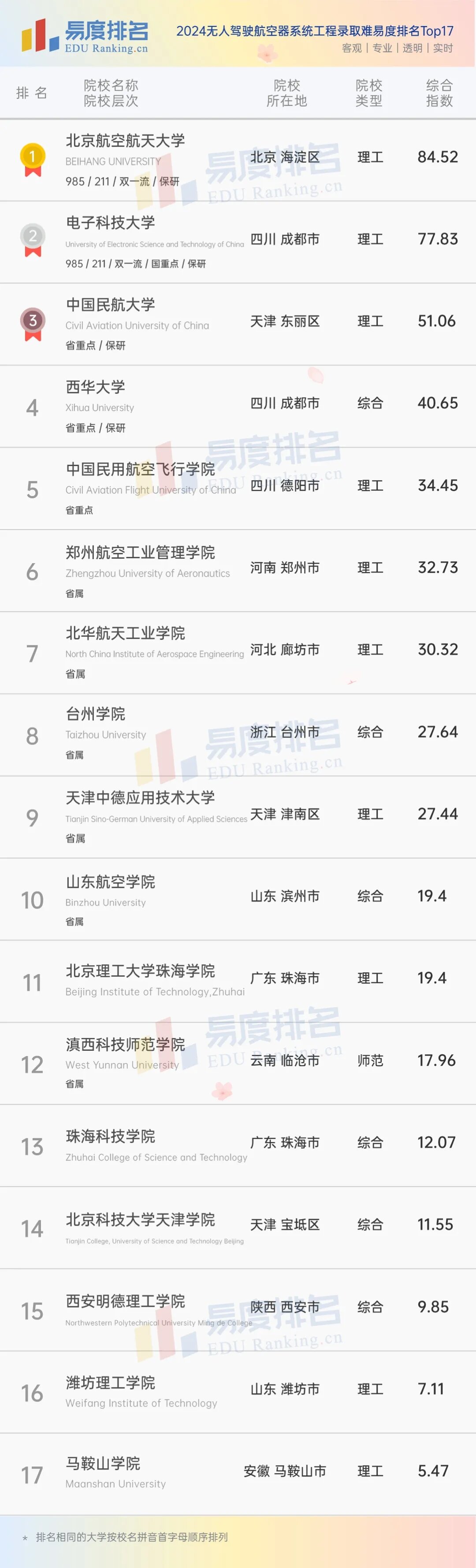 目前仅有17所院校在本科批次招生,比去年多了1所,北航和电子科大是唯二的985院校,院校层次差异较为明显,想要报考该专业的考生建议优先选择高层次和航空类大学,各个排名情况与去年相比相差无几。