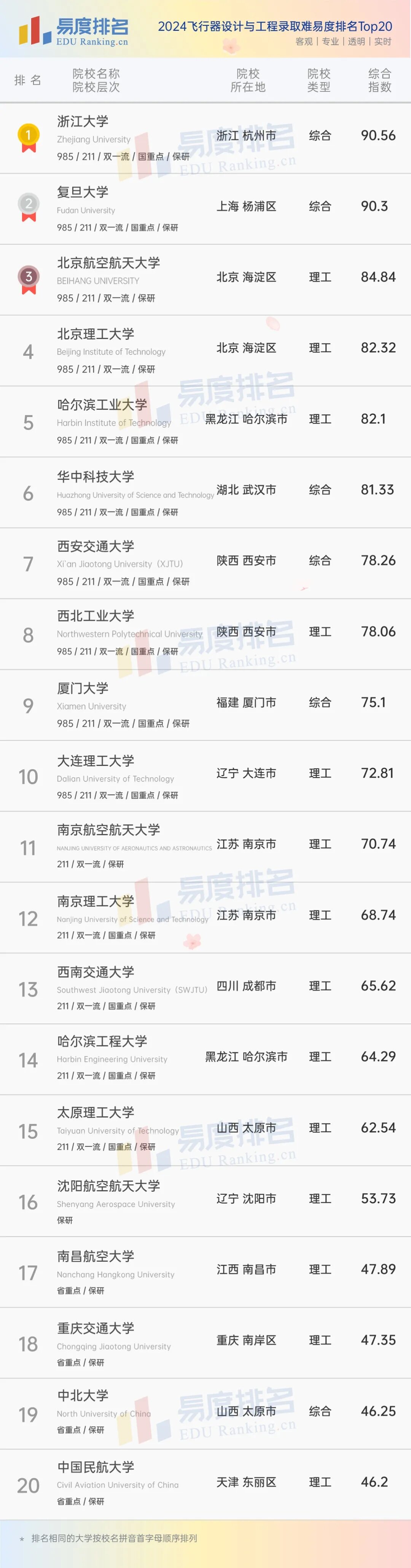 目前有28所院校在本科批次招生,985/211/双一流高校数量占比超过半数,分布的省份也比较多,复旦大学今年首次上榜,排名仅次于冠军浙大,北航作为航空航天大学的顶尖院校,夺得第三名实至名归。