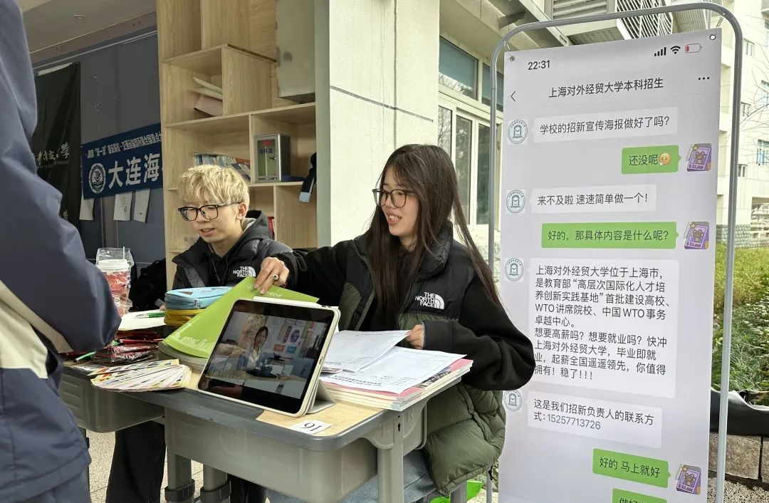 基于对高中学校的回馈和参与上经贸大寒假志愿宣传活动的初衷,金融管理学院的2023级本科生项晨曦与国际经贸学院的2023级本科生季俊杰联系了母校的高三年级组长,并准备了ppt宣讲和海报周边等摆摊活动内容。