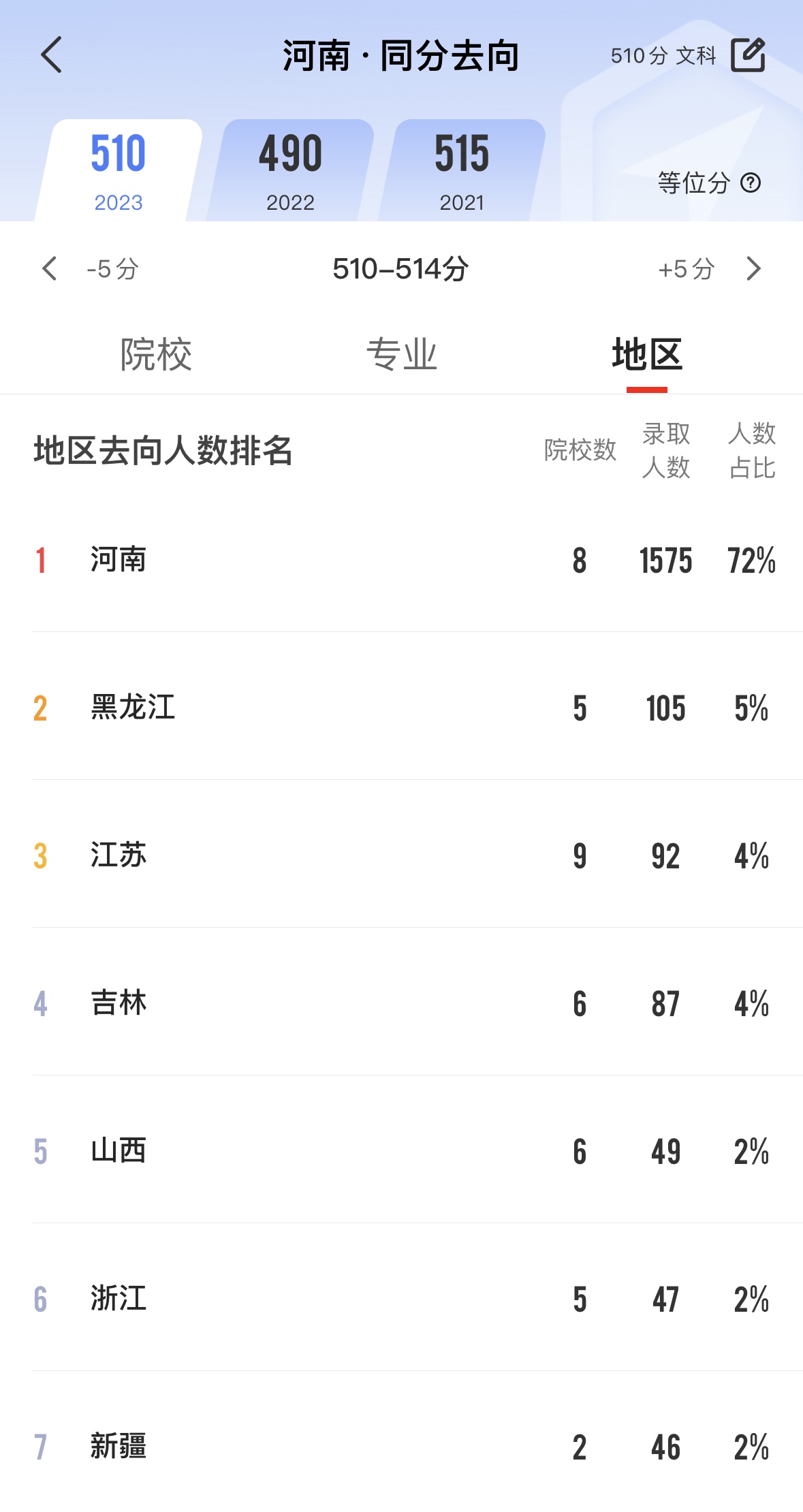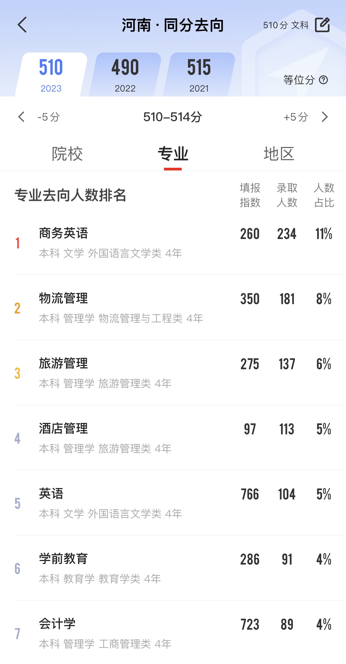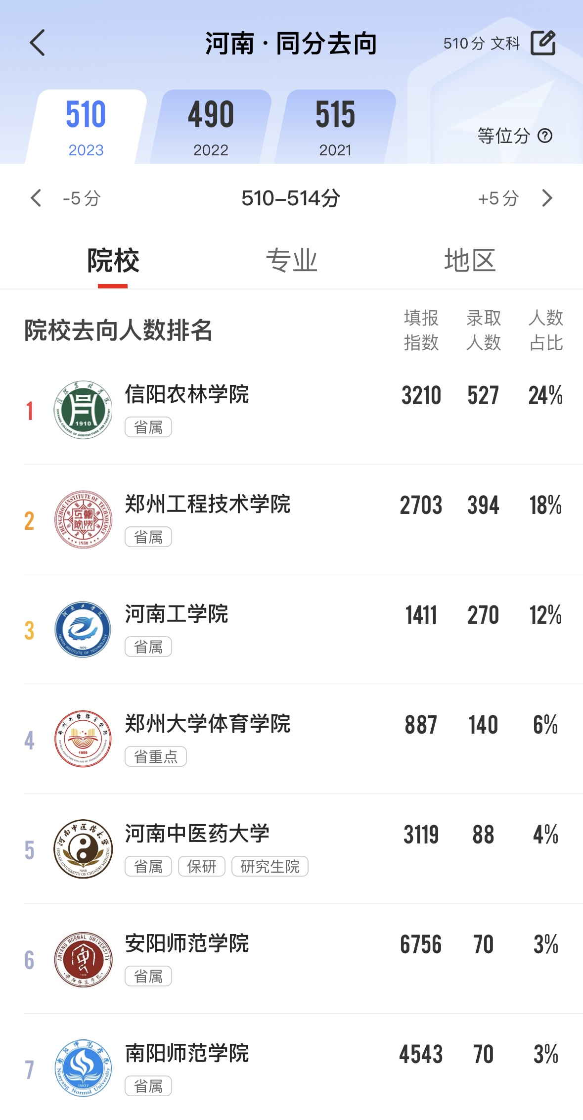以河南510分为例,大家使用优志愿同分去向功能,可以看到近四分之一的考生选择了