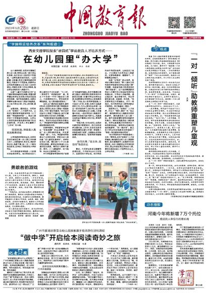2023年4月份,我在参加《中国教育报》“名园现场会”活动过程中,记者了解到我校学前教育专业办学的特色和成效后,主动联系,并进校采访了我、我院任课教师、在校生、校友及个别园长。2023年5月28日《中国教育报》头版头条以《在幼儿园里办大学》为题对我们的培养模式进行全面报道,引起业界广泛关注和一致好评。