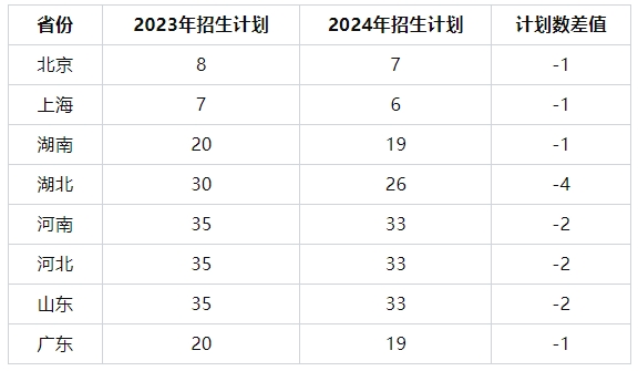 从计划数上来看,湘大在这八省(市)的招生计划数整体减少,整体计划数较上一年减招了14人。其中,湖北省计划数调整最为明显,减少4个计划数。