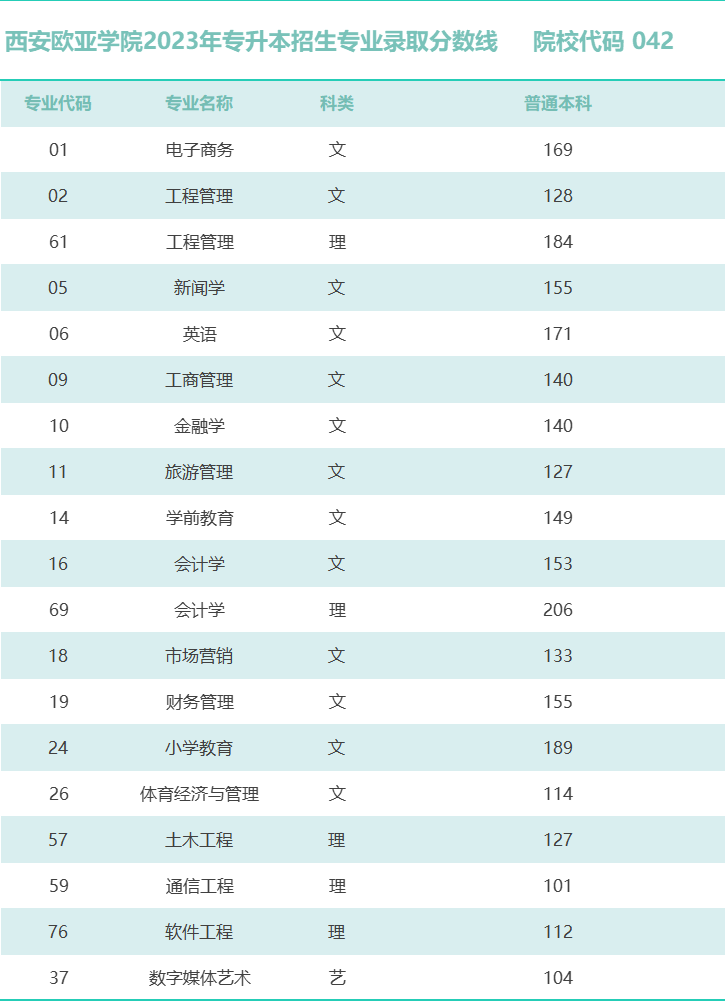 西安欧亚学院专升本招生专业2023年录取分数线参考