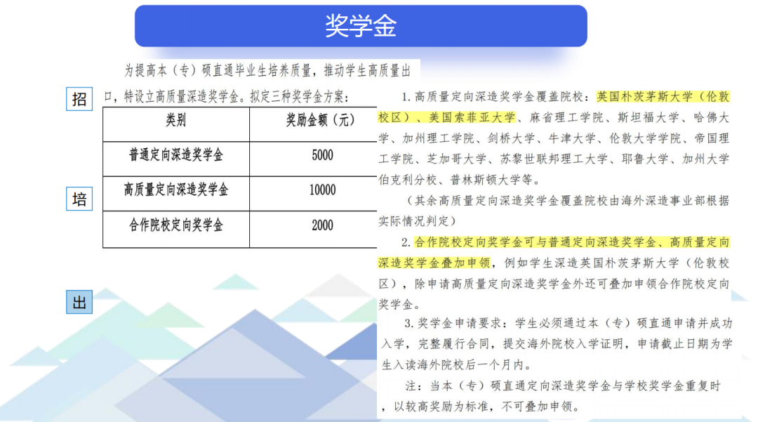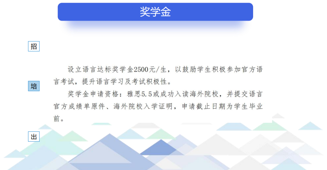为提升学校的全球化氛围,鼓励同学们积极申请并入读海外名校,提升本硕直通国际班学生官方英语语言考试参考率和出国深造比例,凡通过本硕直通国际班录取并入读海外名校,在官方英语语言考试中获得优异成绩的学生都可申请“本硕直通语言高分奖学金”。