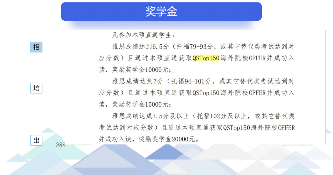 叶张迪(教育学院),托福109分,获得奖学金20000元,现就读于伦敦大学学院(QS2025综合排名第9);袁亚雯(语言文学学院),托福106分,获得奖学金15000元,现就读于伦敦大学学院(QS2025综合排名第9);王凌然(教育学院),PTE73分,获得奖学金15000元,现就读于爱丁堡大学(QS2025综合排名第27);李姝辰(艺术学院),多邻国130分,获得奖学金15000元,现就读于卡迪夫大学(QS2025综合排名第186);谢冰莹(商学院),PTE65分,获得奖学金10000元,现就读于伦敦大学国王学院(QS2025综合排名第40)。李宏达(艺术学院),PTE61分,获得奖学金10000元,现就读于墨尔本大学(QS2025综合排名第13);陶俊玉(商学院),PTE59分,获得奖学金10000元,现就读于墨尔本大学(QS2025综合排名第13);肖百洋(艺术学院),PTE71分,获得奖学金10000元,现就读于卡迪夫大学(QS2025综合排名第186)。此外,为鼓励更多即将新报名加入本硕直通国际班的同学努力学习英语,成功实现海外升硕目标,我们将为大家准备更为多样化、个性化的本硕直通奖学金选择,具体申请规则如下: