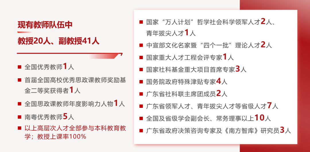 学院高度重视思政教育本科专业教学,承担专业课的教师均为相关专业名牌大学毕业的博士、教授。学院现有教师中教授20人、副教授41人,博士生导师3人,硕士生导师20人,是广东省规模较大的马克思主义学院。学院拥有一支有影响力的教师队伍,现有全国优秀教师1人、首届全国高校优秀思政课教师奖励基金二等奖获得者1人、全国思政课教师年度影响力人物1人、南粤优秀教师5人;现有国家高层次人才“特殊支持计划”哲学社会科学领军人才2人、青年拔尖人才1人,中宣部文化名家暨“四个一批”理论人才2人、国家重大人才工程会评专家1人、国家社科基金重大项目首席专家3人、国务院政府特殊津贴专家4人、广东省社科联主席团成员2人,广东省领军人才、青年拔尖人才等省级人才7人,全国及省级学会副会长、常务理事以上10人。以上高层次人才全部参与本科教育教学;教授上课率100%。