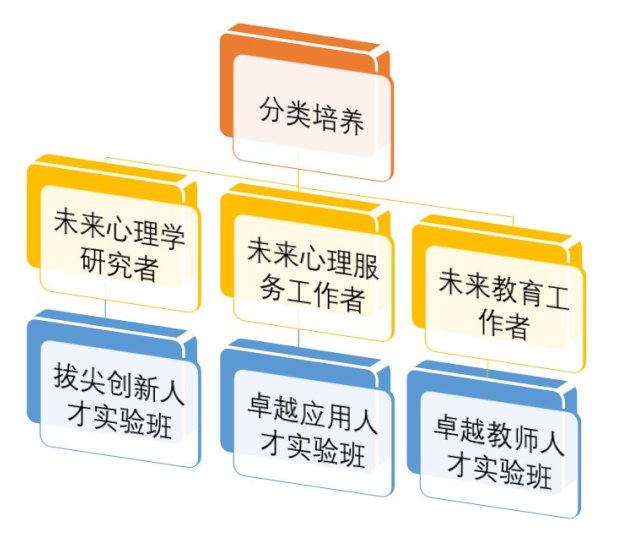 两个方向的本科生实行精准分类培养模式。应用心理学方向设置了拔尖创新人才实验班和卓越应用人才实验班;应用心理学(师范)方向设置了拔尖创新人才实验班和卓越教师人才实验班。拔尖创新人才实验班实行导师制培养模式,为心理学科及其他相关学科输送高质量的研究生生源。卓越应用人才实验班通过校企合作办学,培养心理咨询和人力资源管理与开发方面的应用型人才;卓越教师人才实验班依托国家级和省级师范生技能比赛,通过小班研讨课的授课方式,培养和提升师范专业学生教学能力。