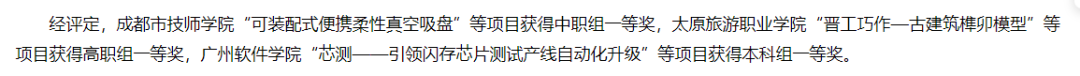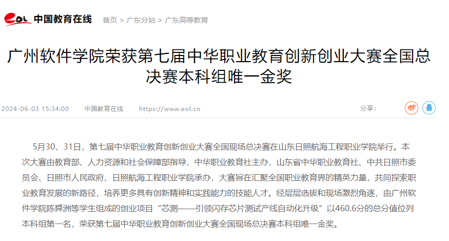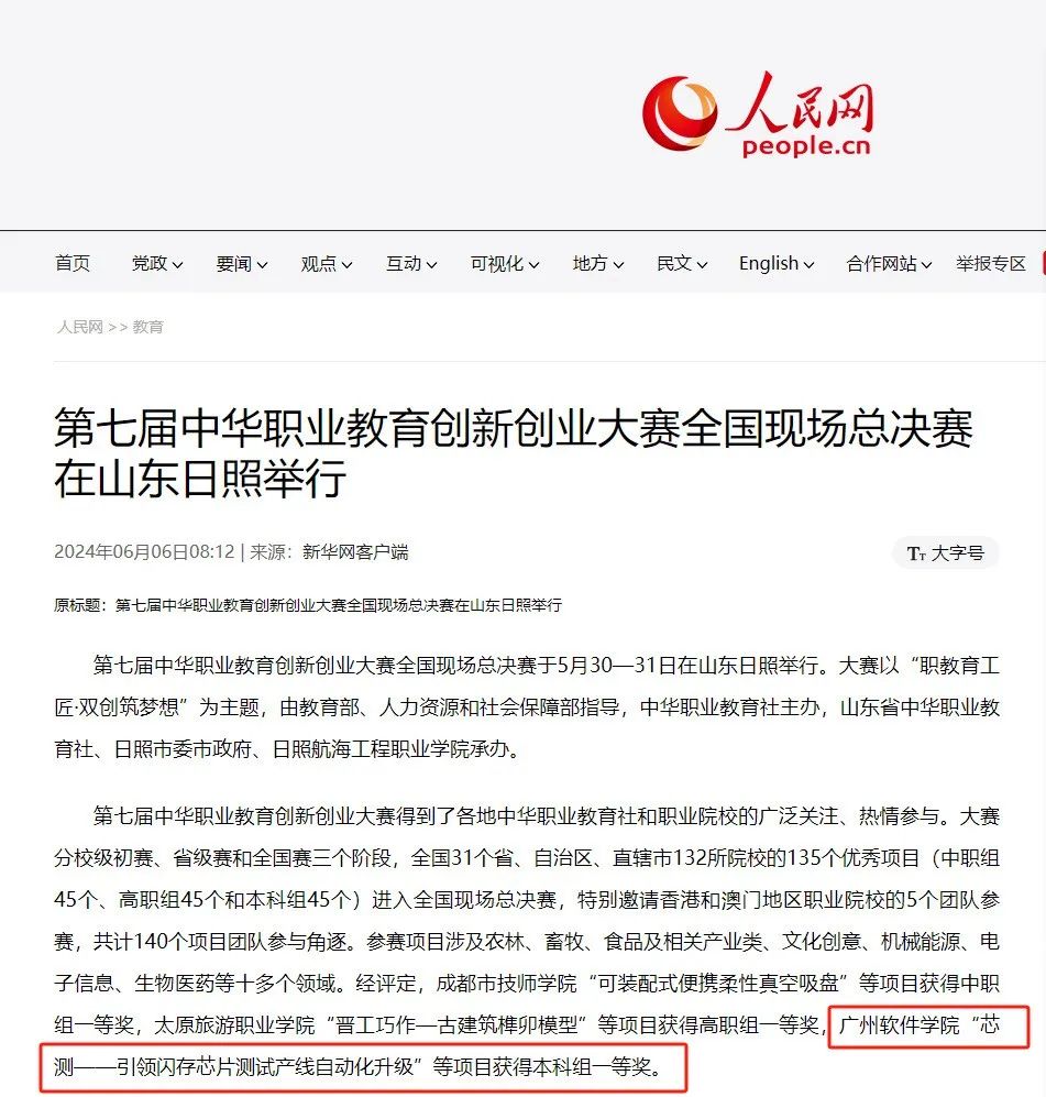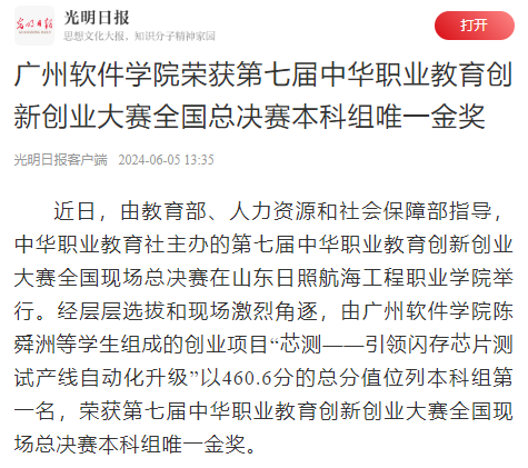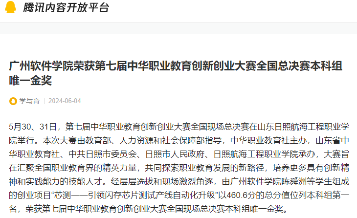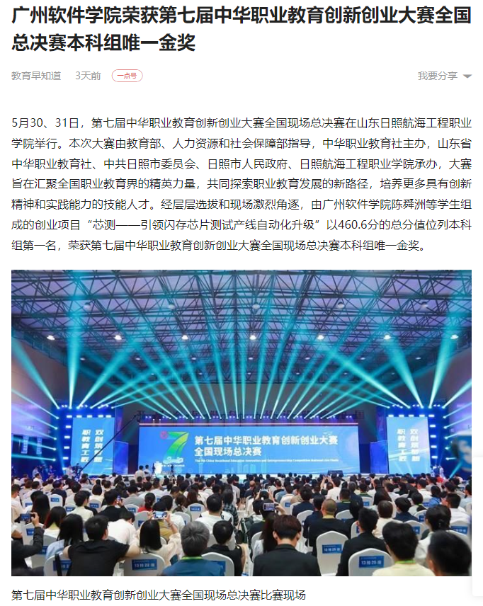 经层层选拔和现场激烈角逐,由广州软件学院陈舜洲等学生组成的团队创业项目“芯测——引领闪存芯片测试产线自动化升级”以460.6分的总分值位列该项赛事本科组第一名,荣获第七届中华职业教育创新创业大赛全国现场总决赛本科组唯一金奖,相继受到人民网、中共中央统一战线工作部网站、光明日报、中国网等官方网站及新闻媒体平台的广泛关注报道。