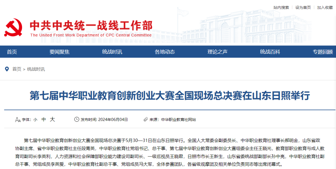 【中共中央统战部网站】第七届中华职业教育创新创业大赛全国现场总决赛在山东日照举行(2024年6月4日)