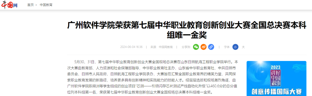 【中国网】广州软件学院荣获第七届中华职业教育创新创业大赛全国总决赛本科组唯一金奖(2024年6月4日)