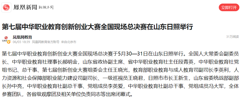 【凤凰新闻】第七届中华职业教育创新创业大赛全国现场总决赛在山东日照举行(2024年6月3日)
