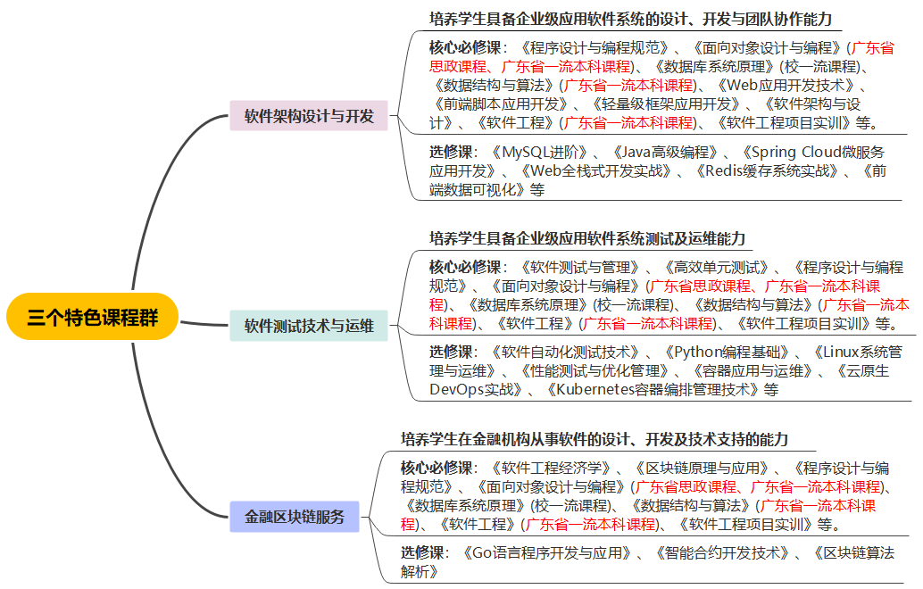 (1)围绕岗位需求,三大特色培养:围绕软件架构设计师、软件开发工程师、软件测试工程师、系统运维工程师、区块链开发工程师等岗位需求,构建了“软件架构设计与开发”、“软件测试技术与运维”、“金融区块链服务”三个特色课程群,培养学生计算机应用与编程能力,软件系统设计、开发与测试工程应用能力,工程项目创新与管理能力。