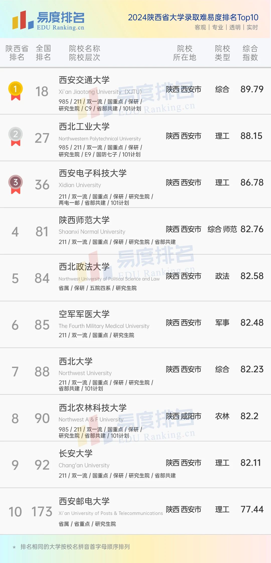 “2024陕西省大学录取难易度排名”的对象是中国64所本科级院校。上榜的60多所院校中,985/211院校共8所,双一流院校共8所。