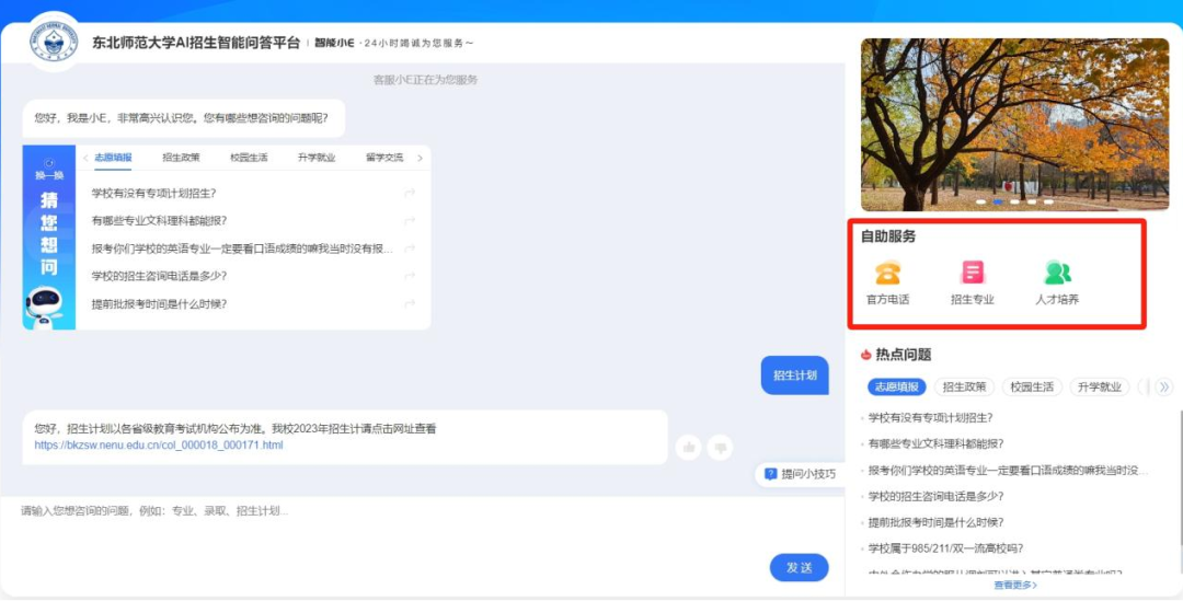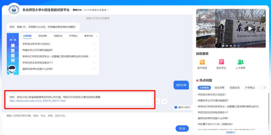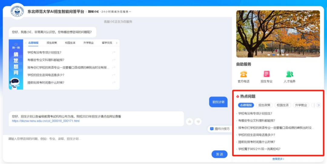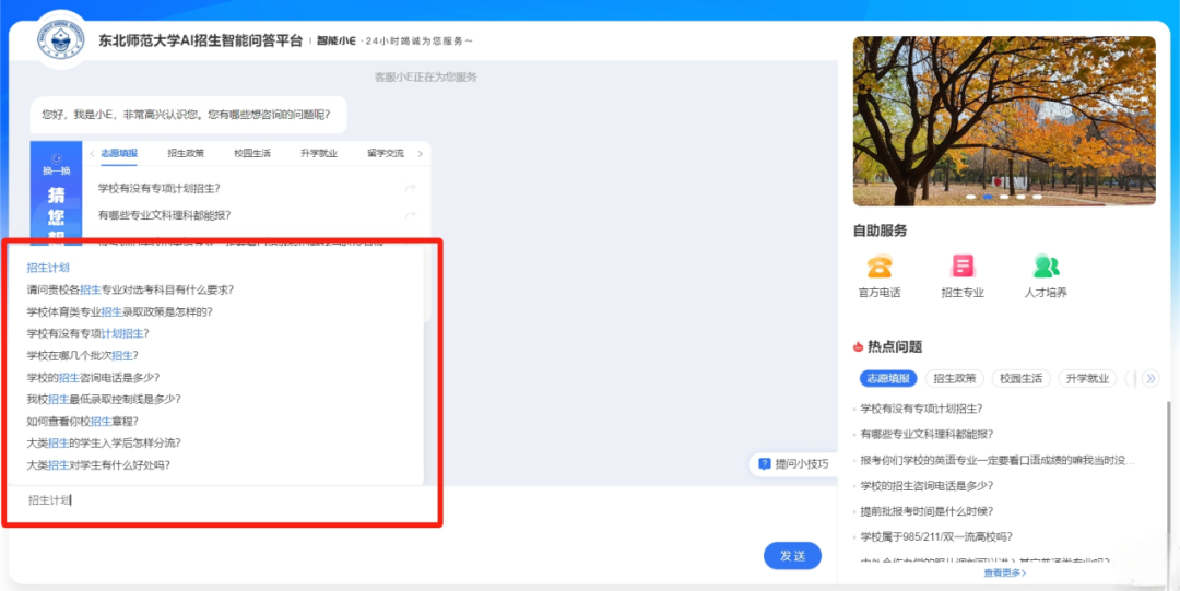 在问答框输入“招生计划”,自动弹出该关键词涉及的相关问题,发送后即可查看详细解答。