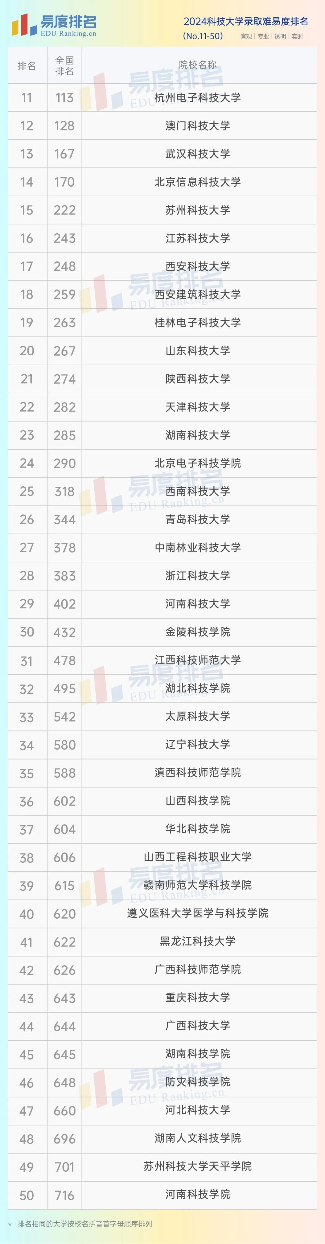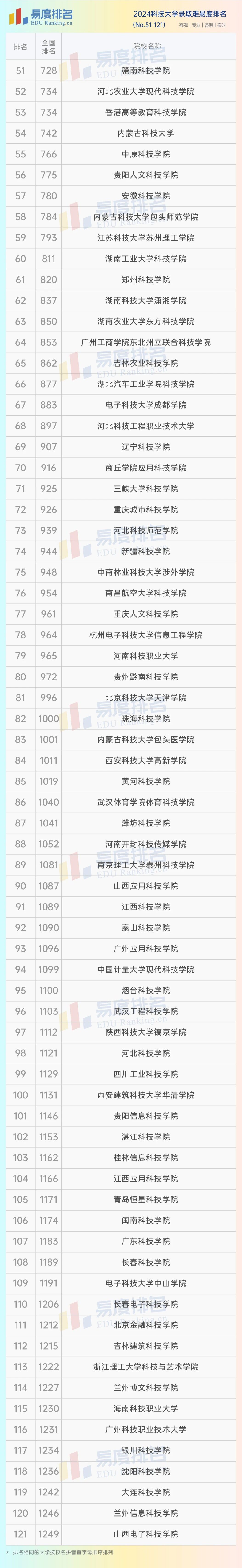 “2024科技大学录取难易度排名”的对象是中国122所本科级院校。上榜的100多所院校中,985/211院校共7所,双一流院校共9所。