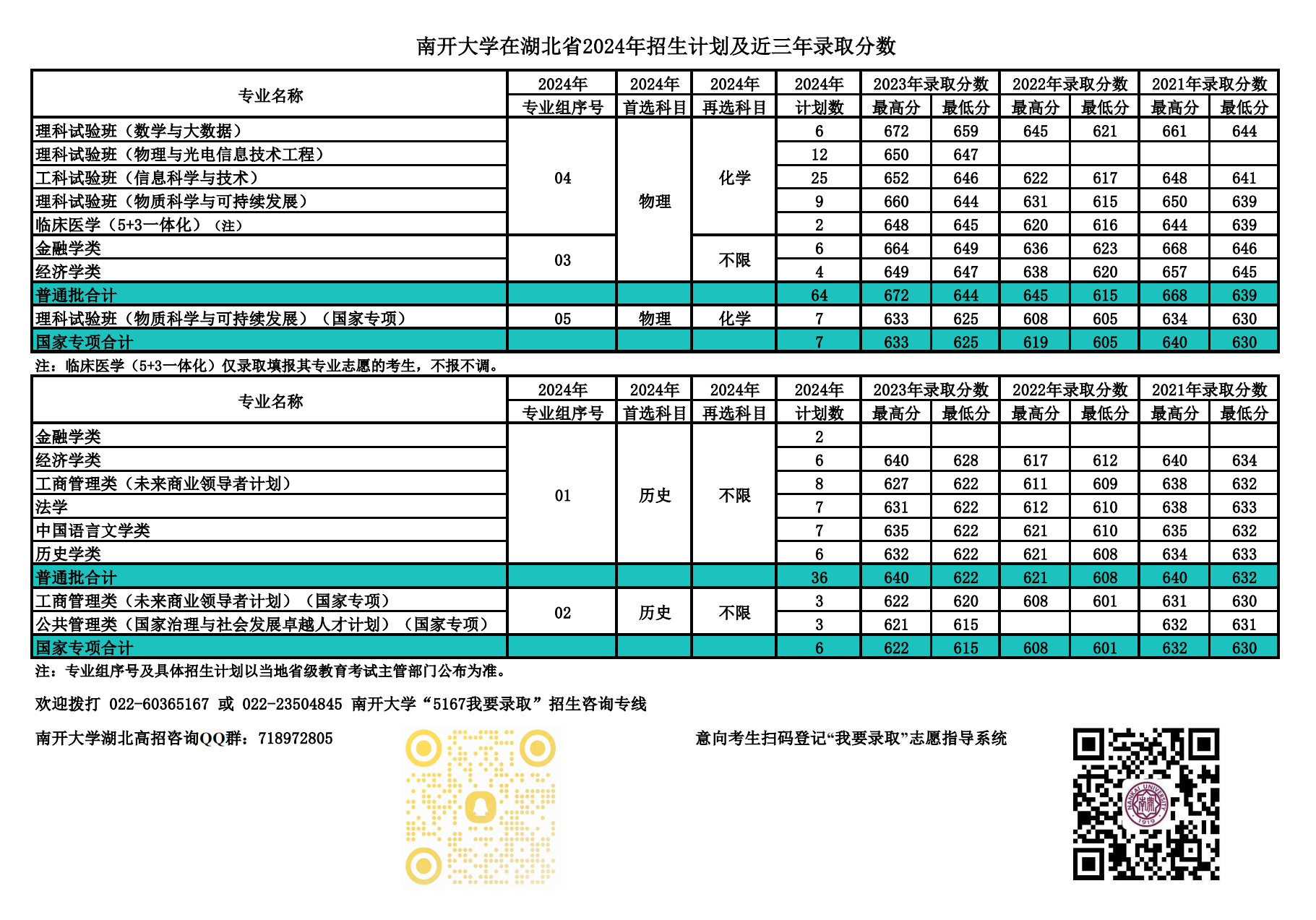 南开大学在湖北省2024年招生计划及近三年录取分数.pdf