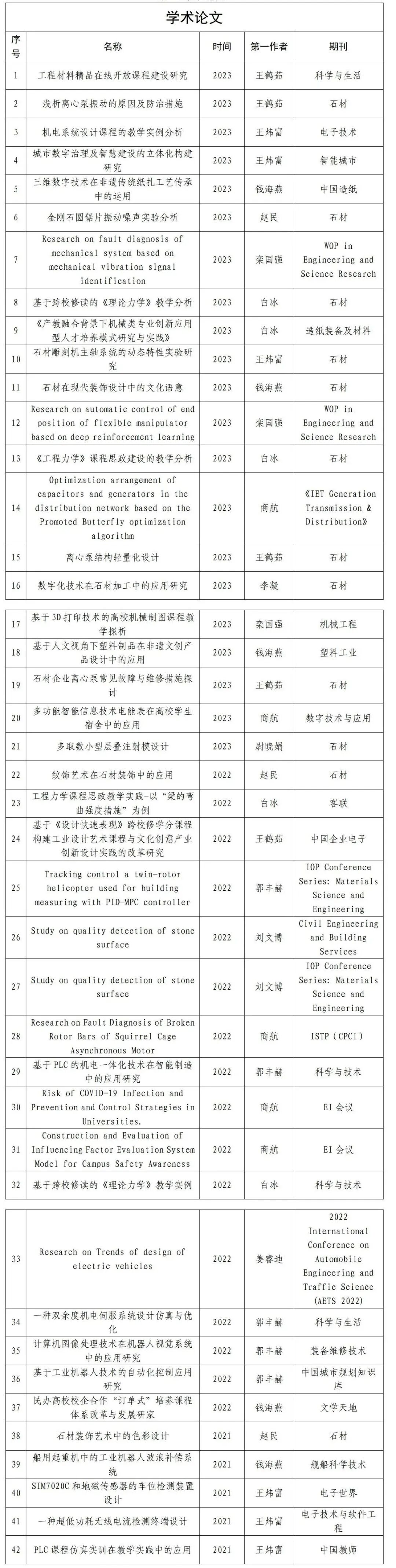 机械工程系致力于专业的建设和发展,关注学生的专业能力培养,贯彻工程教育理念,全面推行OBE人才培养模式,在教育教学中,将教学意识和教育理念融入专业教研成果中。近几年来,在教学研究方面,主持省级、校级教改项目18项,国家级、省级产教融合协同育人项目9项,获取了教学成果奖2项,申报了省级、校级一流课程13项;在科学研究方面,主持参与面上项目6项,横向课题2项,获得个人荣誉27项,国家授权专利7项,在国内外诸多学术期刊、会议等发表论文40余篇。在教学研讨中发展专业特点和优势。