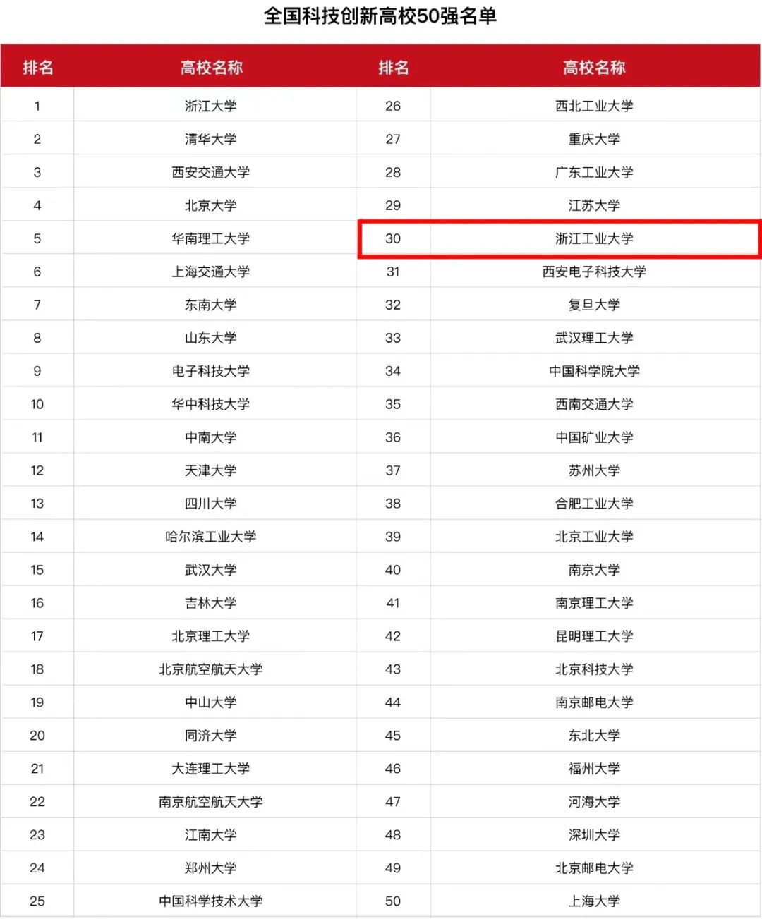 全国科技创新高校50强第30位