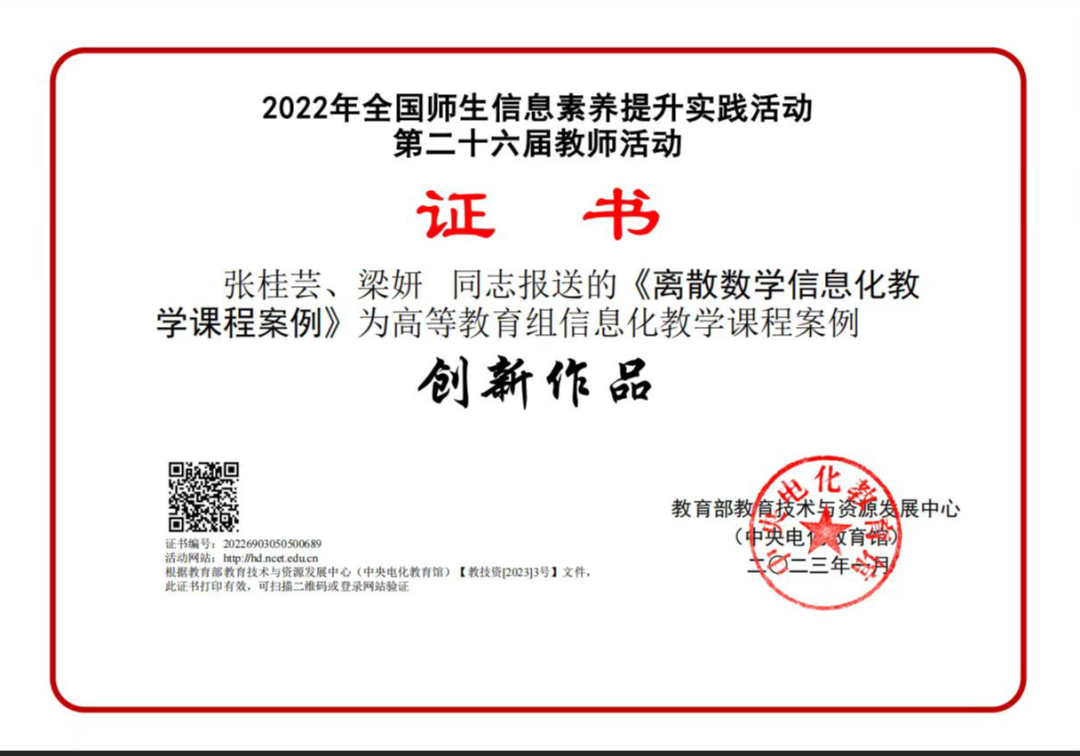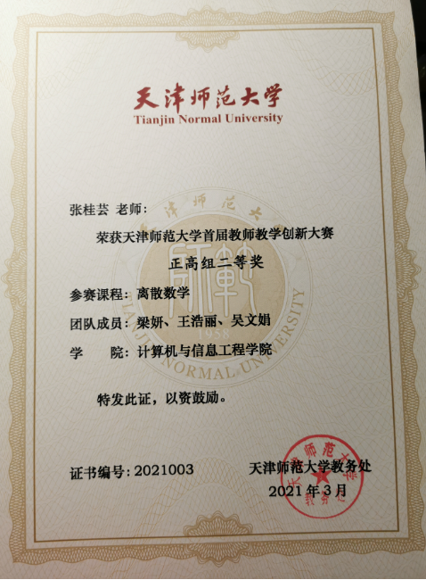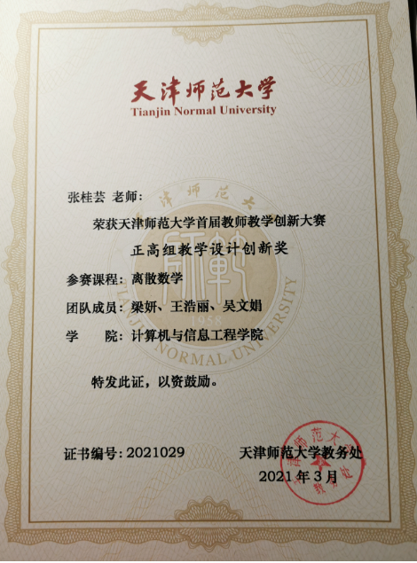 三、 守正创新 探索教学改革之法 她努力思考与钻研教学,特别关注高等教育的文件精神与改革动向,并落实到教学实践中。曾获天津市青年教师 基本功大赛一等奖、教改优秀论文,校青年教师 基本功大赛一等奖三次和优秀教案奖以及校教学成果二等奖。曾获天津市第八届社会科学优秀成果三等奖。2021年获得校首届教师 教学创新大赛正高组的二等奖和教学设计创新奖。主持和参加省部级及以上教改项目7项。出版离散数学等计算机专业教材14本,其中包括国家“十一五”规划教材。组织出版三套计算机专业教材。《教育数据 分析(课程)》天津市工程专业学位优秀课程。
