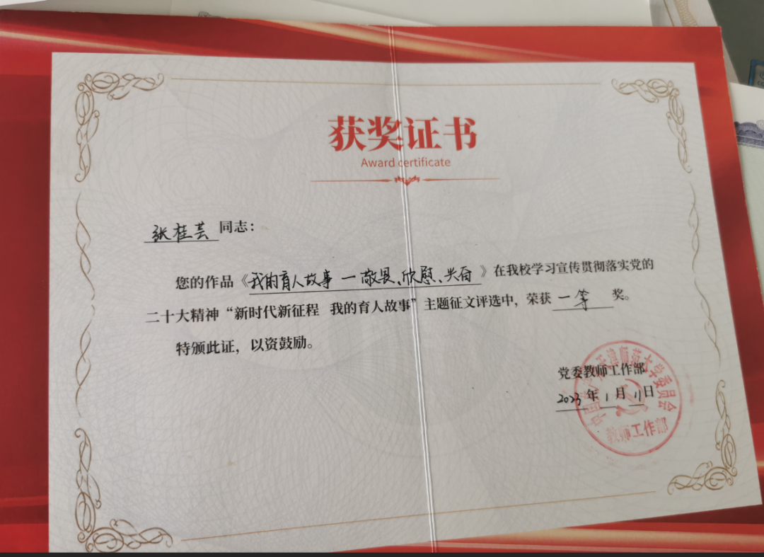 一、培根铸魂,践行立德树人使命 她秉承对学生负责、对学生的家庭负责、对社会和国家负责、对自己的教师 职业负责的坚定信念,以德立身、以德立学、以德施教。努力从德高、学高和艺高培根铸魂自己的立德树人根本任务,努力做有理想信念、有道德情操、有扎实学识、有仁爱之心的四有好老师。曾获天津市劳动竞赛示范岗先进个人、学院首届“德学兼备”领路人等称号。在2022年学校举办的“我的育人故事”征文中获一等奖。学校主页和报刊中多次宣传她的事迹。