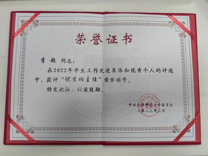 在学生工作方面,李超还担任2017级软件工程 1班班主任,经过四年的悉心培养,班风学风良好,考研成功率达18.4%,高于学院同期水平7个百分点。9名同学赴天津大学 、东北大学 、北京交通大学 等知名院校攻读研究生。目前,他正在担任2021级软件工程 5班班主任。2021年,他被学院评为"德学兼备领路人"。2023年,获得天津师范大学 优秀班主任荣誉称号。