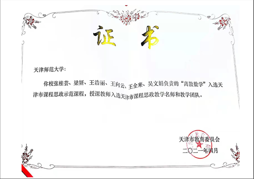 她积极响应习近平总书记强调的:“要用好课堂教学这个主渠道,……其他各门课都要守好一段渠、种好责任田,使各类课程与思想政治理论课同向同行,形成协同效应。”带领团队以德育目标为引领,深度挖掘课程思政资源,探寻思政切入点,精心设计教学环节,紧密结合教学内容,巧妙渗透思政教育,如盐化水、春风化雨、潜移默化地融入学生人生观、世界观和价值观的培养,她深耕三尺讲台,以德立身、以德立学、以德施教,构建知识传授、价值引领、品格塑造、能力培养“四位一体”育人格局。2021年获评天津市高校本科课程思政教学名师、校研究生课程思政教学名师。辅导两位青年教师 撰写“党史专题课程思政精品课评选”教案,“课程思政”优秀教学案例和典型做法。获得天津市工程专业学位优秀指导教师 ,作为负责人获得天津市工程专业学位优秀课程,作为主要成员获得天津市教学成果二等奖。获得“天津师大教学名师”、“优秀教师 ”等称号。2023年她带领离散数学教学团队获得了校级师德建设先进集体。
