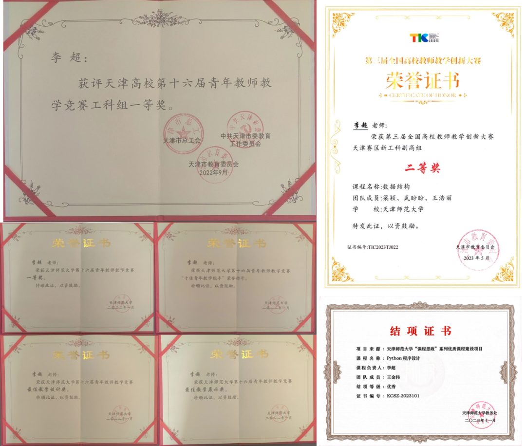 他曾获得天津师范大学 青年教师 教学竞赛工科组一等奖、最佳教学展示奖、最佳教学设计奖、入选天津师范大学 青年十佳教学能手。2022年获天津第十六届高校青年教师 教学竞赛工科组一等奖,取得我校青年教师 教学竞赛工科组历史最好成绩。2023年获第三届全国高校教师 教学创新大赛天津师范大学 赛区新工科副高组一等奖,2023年获第三届全国高校教师 教学创新大赛天津赛区新工科副高组二等奖。2023年,他主持的校级“课程思政”系列优质课程建设项目被评为优秀结项项目。