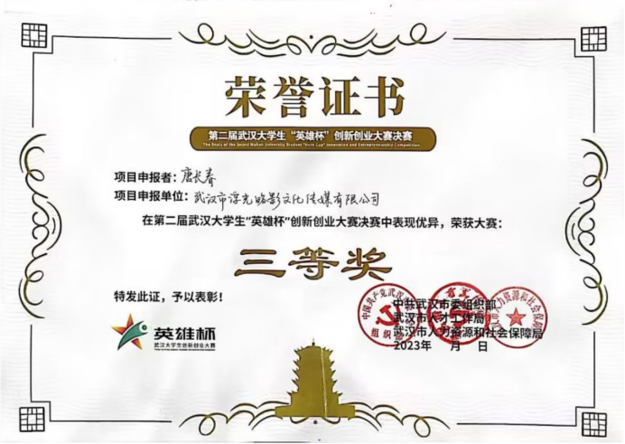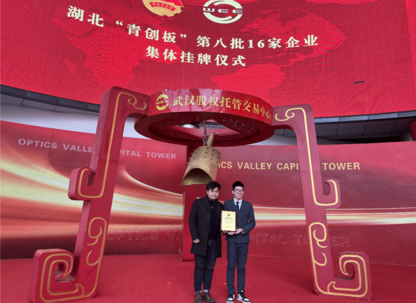 唐长春(右),现任武汉市浮光略影文化传媒有限公司董事长,武汉星创科技有限公司联合创始人。2022年度“中国大学生自强之星”,2023年“湖北向上向善好青年”;荣获第九届中国国际大学生创新大赛国家级银奖及省赛金奖,2023年湖北青年“创青春”创新创业大赛金奖,第五届湖北省中华职业教育创新创业大赛金奖等10余个双创大赛奖项。其创业事迹曾被中央电视台等60余家媒体报道。上图为唐长春创办的“武汉市浮光掠影文化传媒有限公司”在湖北青创板挂牌上市。