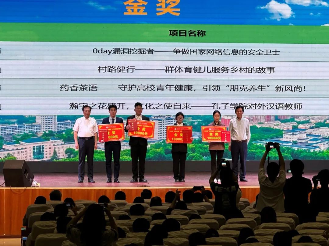 2024年“长河-阳春杯”创新创业大赛我院2021级英语专业朱滢璐同学(右二)荣获金奖
