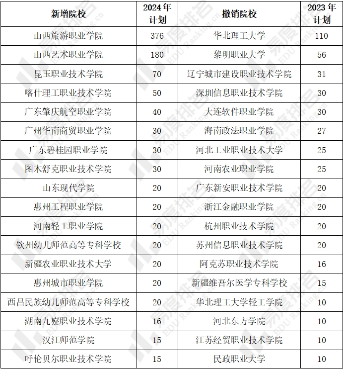 表 1 2024年山西高考新增与撤销院校TOP20(专科普通批次)