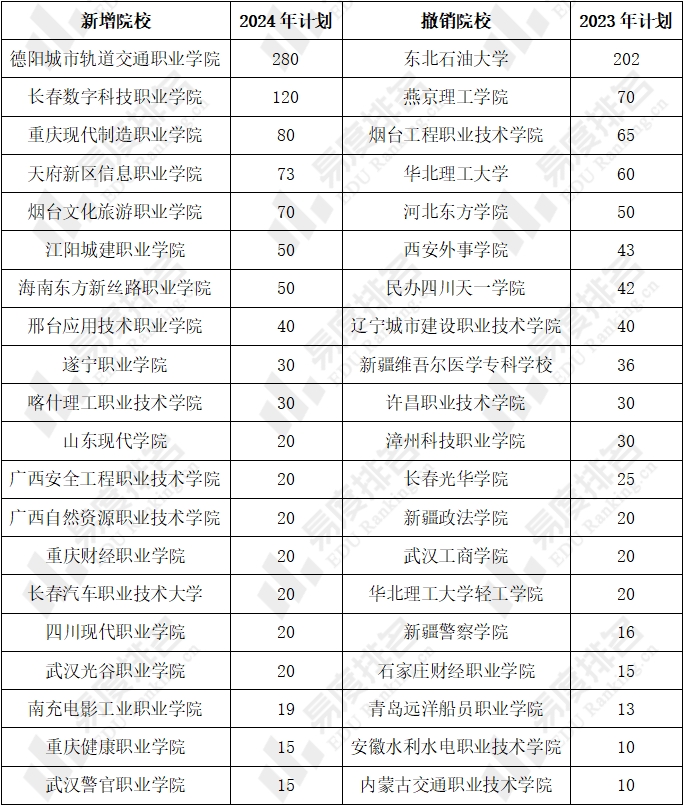 表 1 2024年黑龙江高考新增与撤销院校TOP20(专科普通批次)