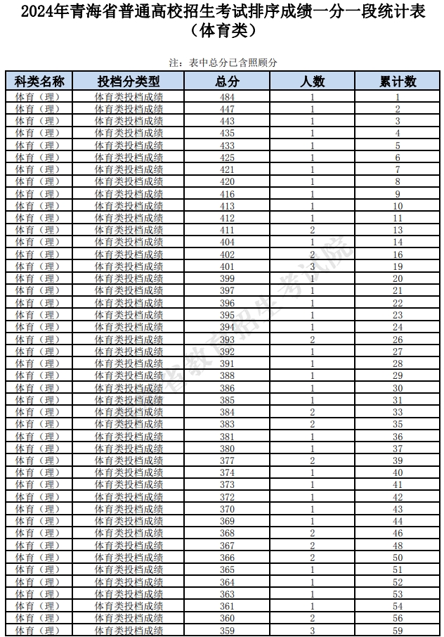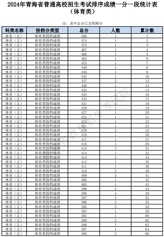 文章来源:青海教育考试网 2024年青海省普通高校招生考试排序成绩一分一段统计表(体育类)